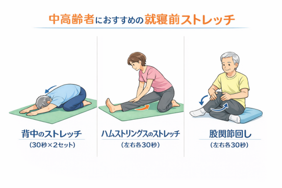 ここでは、就寝前に行いやすいストレッチを3つ紹介します。