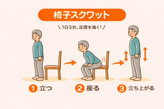 年齢を重ねても自分らしく生活し続けるためには、下半身の筋力を維持することがとても大切です。筋力が低下すると、つまずきやすくなったり、歩くスピードが遅くなったりして、転倒のリスクが高まります。そこで今回は、高齢者の方でも自宅で安全に取り組みやすい「椅子スクワット」をご紹介します。